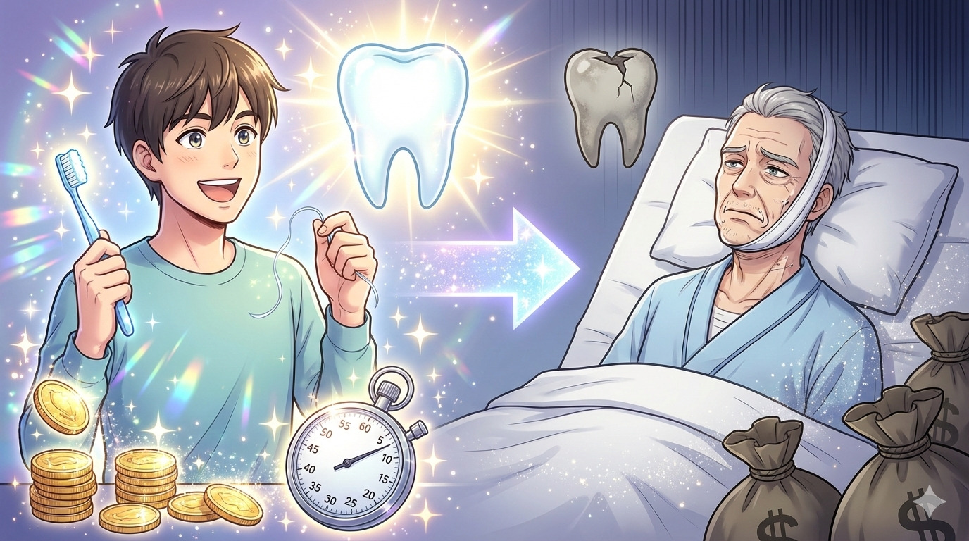 多くの人は、「歯みがきは面倒な毎日の日課」だと思っています。しかし、それは大きな間違いです。 毎日のたった数分の歯みがき、そして定期的な歯科医院への健康診断訪問は、あなたの将来の資産を何百万円も守るための「超・低リスク・ハイリターンな投資」なのです。